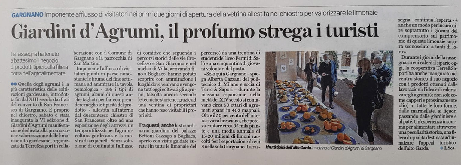 L'associazione di promozione sociale Terre&Sapori d'alto Garda organizza anche questo anno, con la collaborazione del Comune di Gargnano e della Parrocchia di San Martino di Gargnano, la settima edizione di Giardini d’Agrumi il 18 e 19 aprile 2022, manifestazione dedicata alla promozione e valorizzazione delle straordinarie limonaie alto gardesane e degli agrumi che in esse ancora vengono coltivati, a scopo produttivo o decorativo.