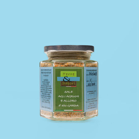 Ingredienti: sale fino integrale siciliano (85%), scorze essiccate di agrumi d’alto Garda non trattati (limone, arancia amara, mandarino, cedro, bergamotto, limette in proporzione variabile) e foglie di alloro (laurus nobilis) d’alto Garda (15%, in proporzione variabile).
